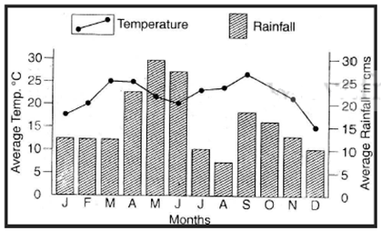 38] The graph given below shows the mean average monthly temperatures (in °C) and mean monthly rainfall (in cms) of a place: [1995]